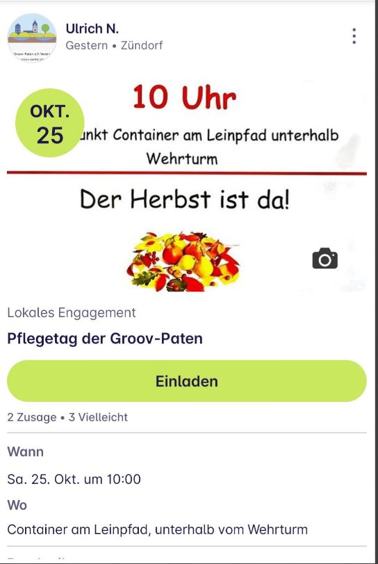 Werden Sie Mitglied bei „Die Groov-Paten e.V.“! Mit 30 Euro (Mindestbeitrag im Jahr) fördern Sie unsere Vorhaben. Ihre persönliche, tatkräftige Mithilfe bei unseren Aktionen ist immer willkommen.