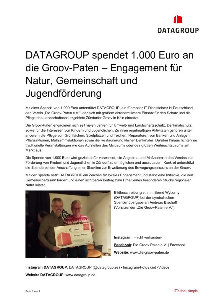 Mit einer Spende von 1.000 Euro unterstützt DATAGROUP, ein führender IT-Dienstleister in Deutschland, den Verein „Die Groov-Paten e.V.“, der sich mit großem ehrenamtlichem Einsatz für den Schutz und die Pflege des Landschaftsschutzgebiets Zündorfer Groov in Köln einsetzt. Die Groov-Paten engagieren sich seit vielen Jahren für Umwelt- und Landschaftsschutz, Denkmalschutz, sowie für die Interessen von Kindern und Jugendlichen. Zu ihren regelmäßigen Aktivitäten gehören unter anderem die Pflege von Grünflächen, Spielplätzen und Teichen, Reparaturen von Bänken und Anlagen, Pflanzaktionen, Müllsammelaktionen sowie die Restaurierung kleiner Denkmäler. Darüber hinaus richten sie traditionelle Veranstaltungen wie das Aufstellen des Maibaums oder des großen Weihnachtsbaums am Markt aus.